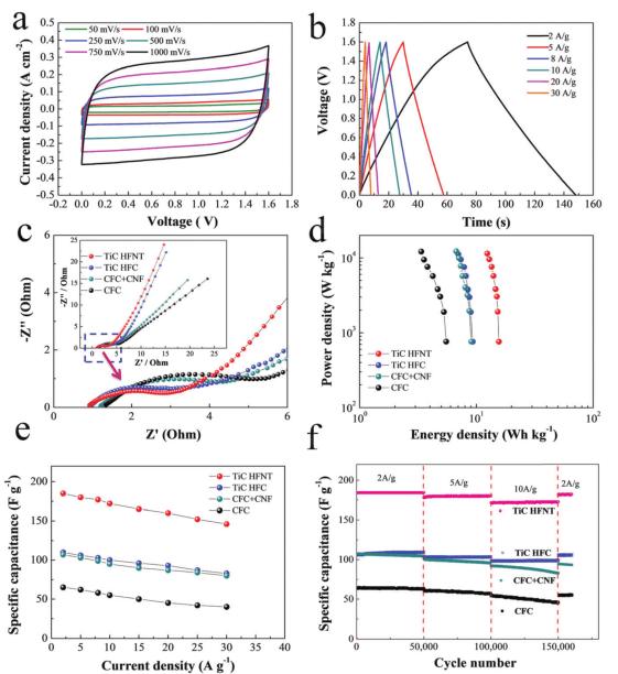 將材料制備成電容器,測試電容器的循環(huán)伏安曲線,不同倍率下的循環(huán)曲線,倍率曲線,交流阻抗圖譜等相關(guān)測試。