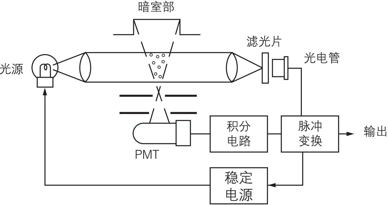測(cè)試方法使用光散射及β線(xiàn)吸收等,F(xiàn)ig.1 是原理圖。如果光通過(guò)的地方有浮游粒子,光照到浮游粒子上就會(huì)產(chǎn)生散射,浮游粒子越多,散射光越強(qiáng)且和浮游粒子的量成比例。在這種儀器中,用光電倍增管來(lái)接收該散射光,將此信號(hào)積分后變換成脈沖信號(hào),使其輸出和濃度相對(duì)應(yīng)。因?yàn)檫@種方法對(duì)濃度的變化能立刻跟蹤,因此適用于要監(jiān)視連續(xù)且長(zhǎng)時(shí)間變化的場(chǎng)合。