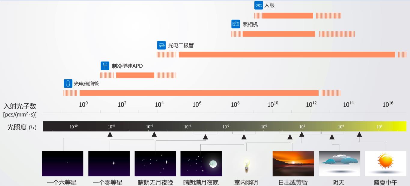 圖2 不同探測(cè)器件可探測(cè)光強(qiáng)范圍