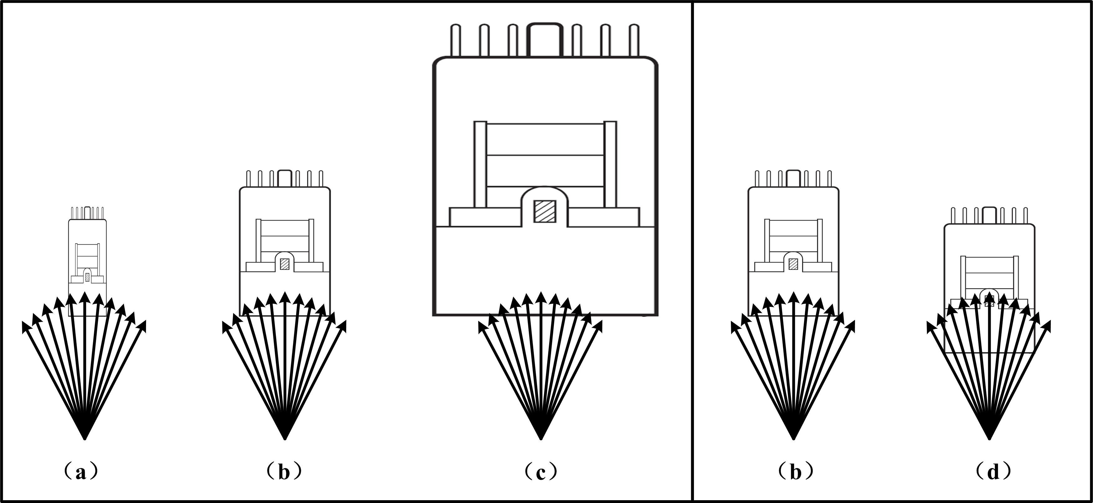 根據(jù)入射光的光斑形狀、大小、與PMT的距離關(guān)系等選擇合適的PMT。如狹縫形的光斑更適合用側(cè)窗型PMT。陰面大小選擇以盡量多的收集光束為原則,如圖2所示,在光源特性完全一致的情況下,(a)PMT陰面尺寸略小,不能有效收集光信號(hào);(c)光信號(hào)雖可全部入射到PMT上,但光斑相對(duì)陰面尺寸過(guò)小,陰面邊緣部分沒(méi)有有效信號(hào),卻會(huì)產(chǎn)生噪聲,使信噪比下降;(b)尺寸的選擇明顯優(yōu)于(a)和(c);(d)相比(b)而言,減小光源與PMT之間的距離,可提高光信號(hào)的收集效率、增大PMT的探測(cè)效率,是PMT的方案。