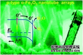 中科院理化所師文生課題組在具有ZnO陣列的FTO上,用電沉積的方式制備了FeOOH,通過高溫離子擴散的方式使Zn2+摻雜入Fe2O3, 后去除ZnO模板獲得了p型Zn2+摻雜Fe2O3的空心納米管光陰,并展現(xiàn)出了較高的開啟電勢。(上圖,DOI:10.1039/C3CC40599K)