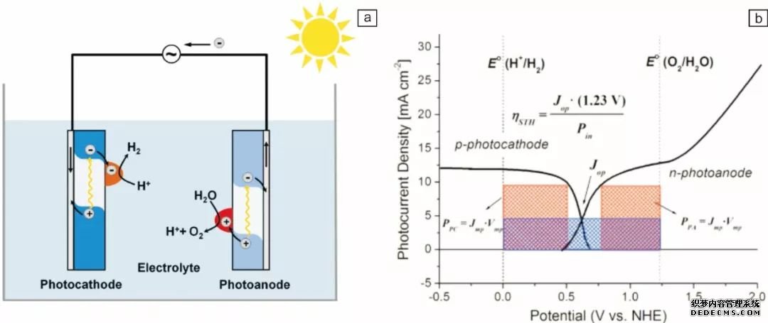圖1 p-n 疊層光電化學(xué)水分解電池示意圖(a) 和性能曲線(b)