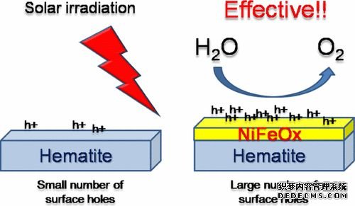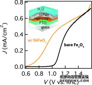 但目前在Fe2O3上降低開啟電勢有效的催化劑為NiFeOx。關(guān)于Fe2O3的開啟電勢差,Dunwei Wang課題組認為是由于Fe2O3大量的表面態(tài)導(dǎo)致費米能級釘扎,通過NiFeOx助催化劑的引入,大程度降低了表面費米能級的釘扎效應(yīng),因此獲得了較好的開啟電勢。(上圖,DOI:10.1002/anie.201306263)