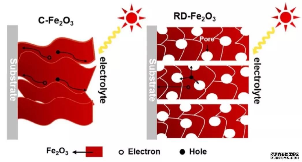 但是,F(xiàn)e2O3同時也存在著吸光系數(shù)差、光生空穴傳輸距離短(2~4 nm) 等限制因素,導(dǎo)致了目前基于Fe2O3光陽的光電轉(zhuǎn)化效率依舊較低。由于Fe2O3的空穴傳輸距離太短,因此對Fe2O3的微納結(jié)構(gòu)調(diào)控顯得尤其重要。