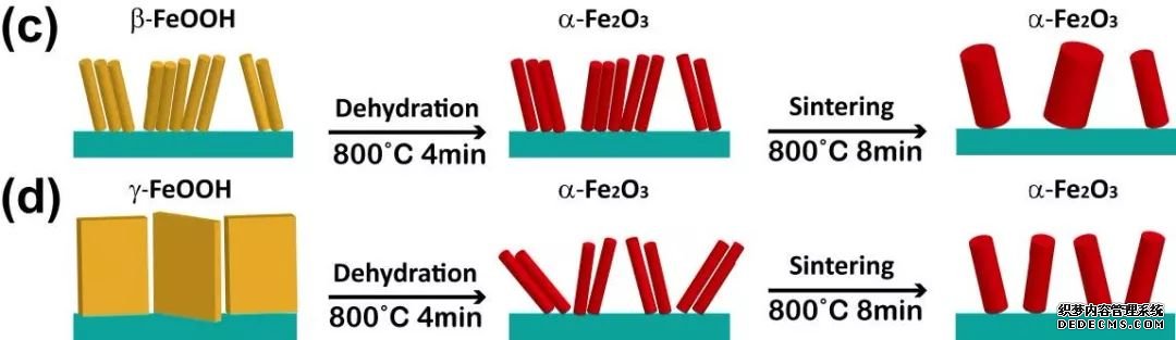 Yilin Liu等發(fā)現(xiàn) FeOOH的晶相結(jié)構(gòu)會對煅燒過程有影響:當(dāng)FeOOH 為緊密堆積的β相時,煅燒過程中納米棒會燒結(jié),終得到的Fe2O3納米棒會比較粗(約65nm);而當(dāng)FeOOH為層狀結(jié)構(gòu)的γ相時,煅燒過程中結(jié)構(gòu)會脫水?dāng)嗔,能生成超細結(jié)構(gòu)的納米棒(約20 nm) ,其光電流相比于直徑較粗的Fe2O3,也有了1.5 倍的提升。(上圖,DOI:10.1088/1361-6463/aa6fb7)