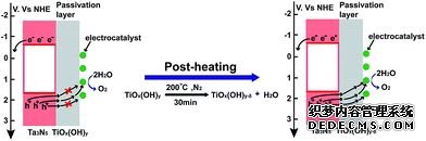 在對TiO2鈍化層的研究中,羅文俊課題組通過化學(xué)浴沉積的方法在Ta3N5上制備了一層TiO2,并且發(fā)現(xiàn)水溶液法制備的TiO2中含有的羥基基團會影響電的性能。
