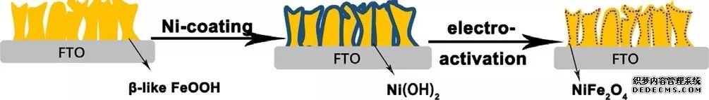 隨后他們制備了亞穩(wěn)態(tài)、大孔道結(jié)構(gòu)的類β相( schwertmannite) FeOOH 薄膜電,并且在其表面負載了少量 Ni(OH)2。在外加偏壓下,覆蓋在亞穩(wěn)態(tài)類β相FeOOH表面的Ni2+會以某種離子或離子團的形式進入到類β相 FeOOH 的結(jié)構(gòu)孔道,與孔道周邊的Fe原子成鍵形成 NiFe2O4,使得雙層催化劑的產(chǎn)氧活性和穩(wěn)定性都大幅提升。α-FeOOH的晶型結(jié)構(gòu)穩(wěn)定,沒有大孔道。因此在外加偏壓下,α-FeOOH/Ni(OH)2并沒有展現(xiàn)出特殊的變化,僅是單純性能的疊加,產(chǎn)氧活性也小于β-FeOOH/Ni(OH)2。因此,在FeOOH、NiOOH雙層電催化劑中,F(xiàn)eOOH 的晶相對Fe/Ni 雙層結(jié)構(gòu)催化劑的性能有較大影響。(DOI:10.1002/asia.201700964)