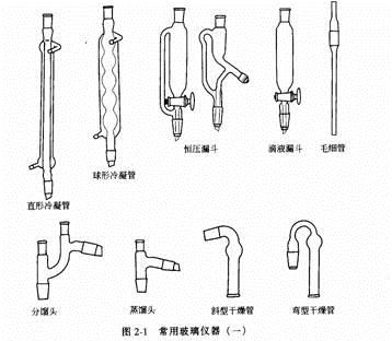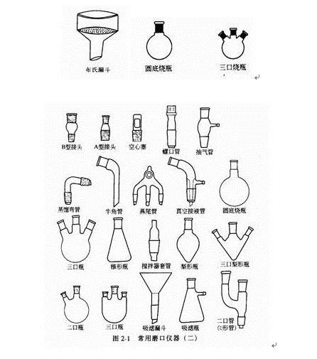 在精細有機合成實驗中使用的一般為標準磨口玻璃儀器。它的用途、容量不同,應注意標準磨口有不同的編號,如 10 號、 14 號、 19 號、 24 號、 9 號和 34 號等。這些編號是指磨口大端的直徑 ( 單位為 mm ,取接近的整數(shù) ) 。洗滌磨口時不得用粗糙的去污粉,以免使磨口擦傷而漏氣。進行真空減壓操作時,磨口處應涂以真空潤滑脂,以免漏氣。一般用途可不涂潤滑脂,以免砧污反應物或產物。若反應中有強堿,則應涂潤滑劑,以免磨口連接處因堿腐蝕粘牢而無法拆開。精細合成實驗所需常用玻璃儀器見圖 2-1 。
